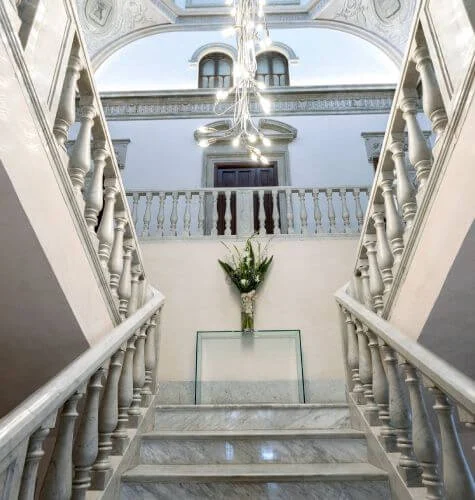 Your stay: the stunning Hospes Palacio de los Patos, where historic architecture meets contemporary luxury.